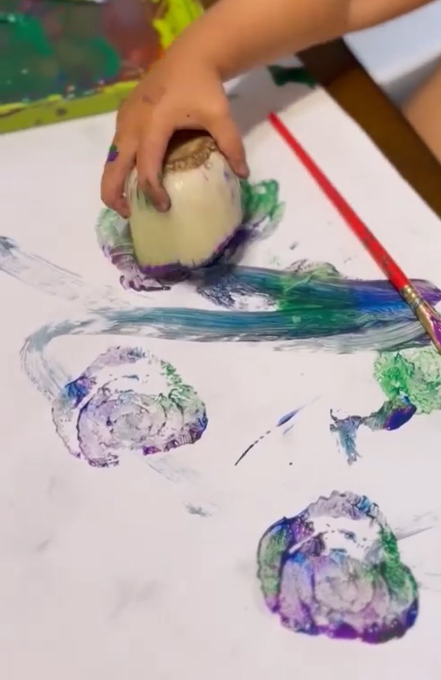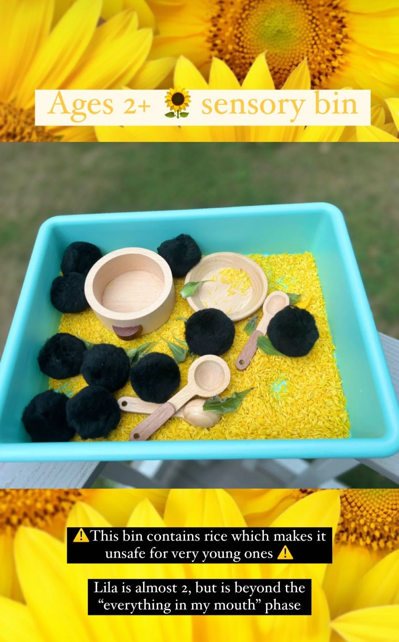 once dry, combine rice, pom poms, leaves, and tools to a shallow container