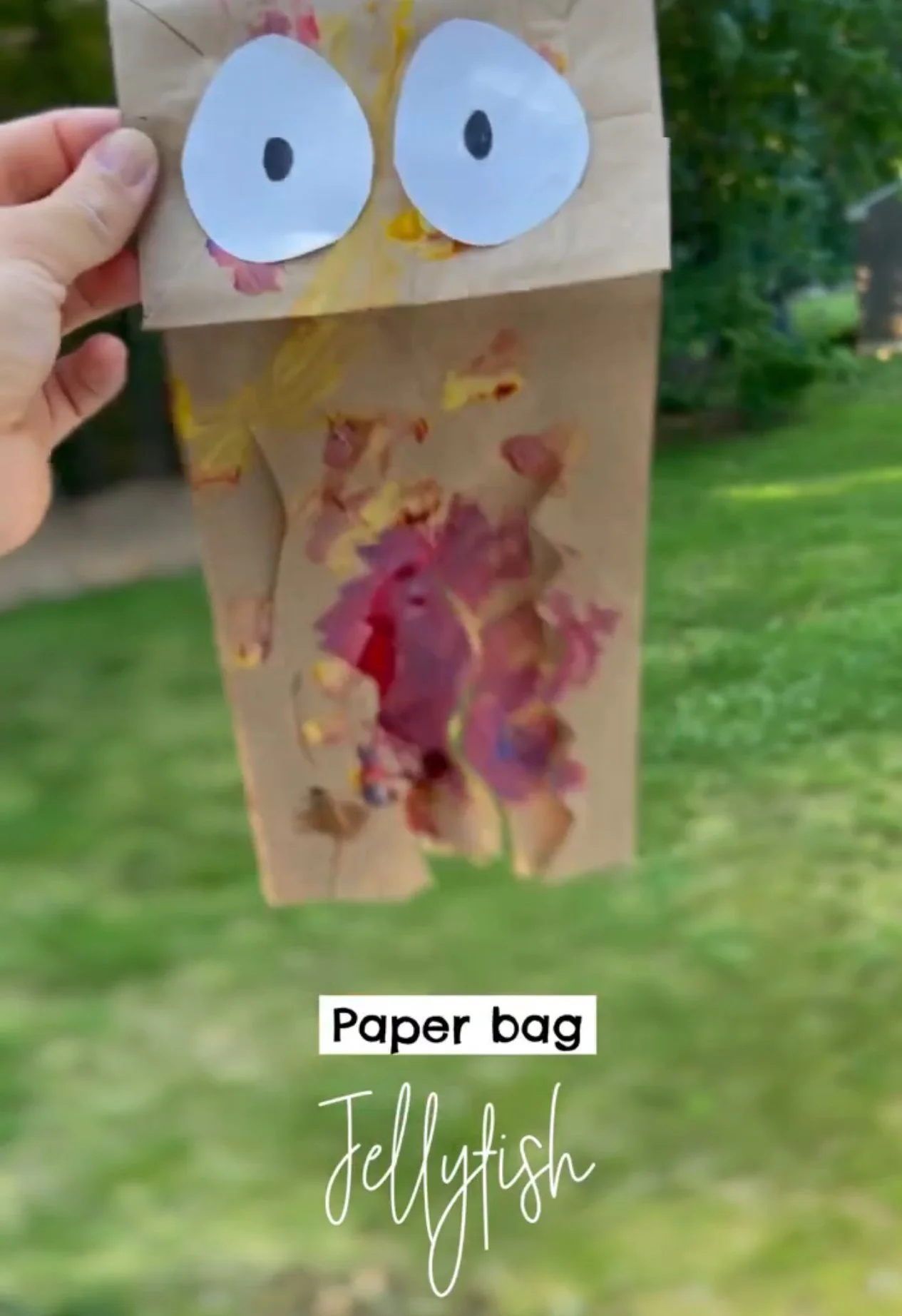 glue googly eyes or glue circles on the folded part of the bag that looks like a rectangle